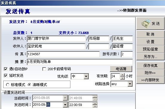 如果你想把一封传真定时或延时在某一个时间发送的时候,myFAX的定时延时功能是你最佳的选择,你只要把传真任务提交到服务器就可以放心了,myFAX会在你指定的时间把传真发送完毕,你不必一直开着电脑。
