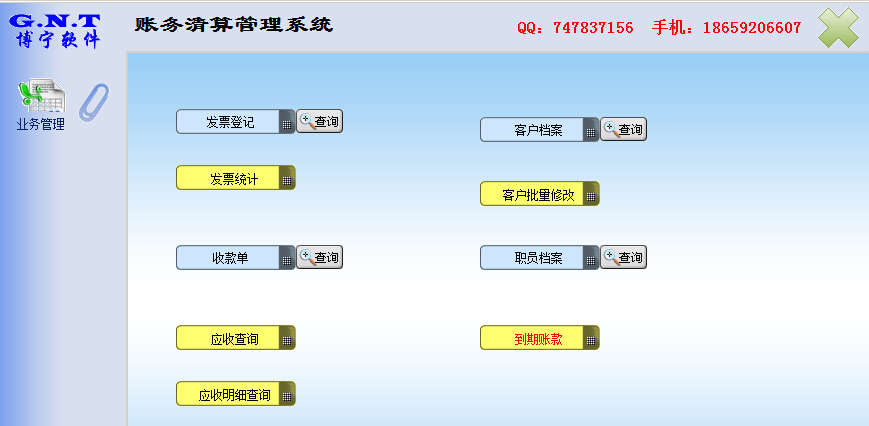 系统简介 这是一个客户介绍的朋友,定做的一套账务清算管理系统,不追求高大上,只希望问题能以最简洁的方式得到有效解决。数据来源于发票登记,主要记录发货单的金额,应收日期,不含进销存的物料数据,物料只是简单的说明,连数量都没有包含。收款单的核销方式,按发票单号来核销,并且可以一次录入多张发票。应收账款到期后,可以在“到期账款”报表上面体现和提醒。 适合客户: 账务清算管理系统 账务管理软件